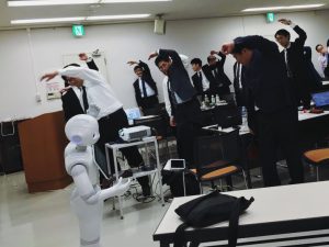 システムズナカシマの朝の様子。Pepperくんのかけ声でラジオ体操をしています。